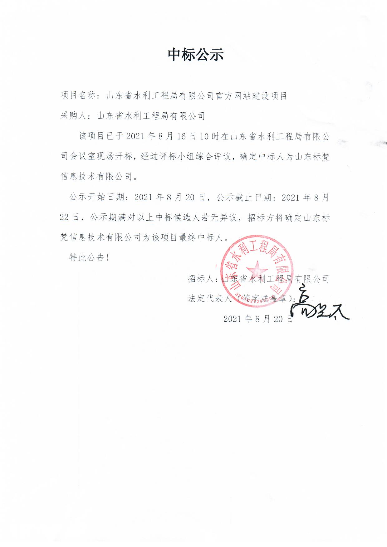 山東省水利工程局有限公司官方網(wǎng)站建設項目中標公示