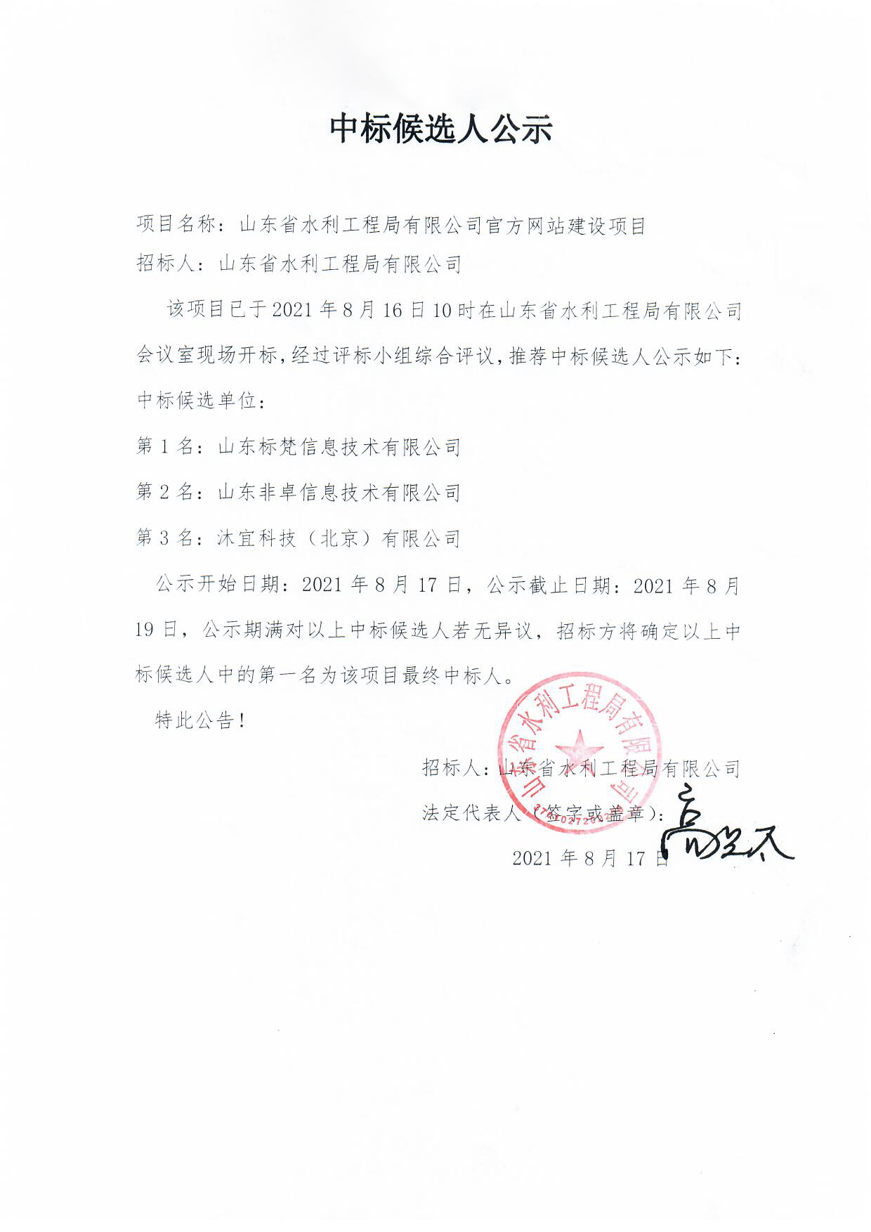 山東省水利工程局有限公司官方網(wǎng)站建設(shè)項目中標候選人公示