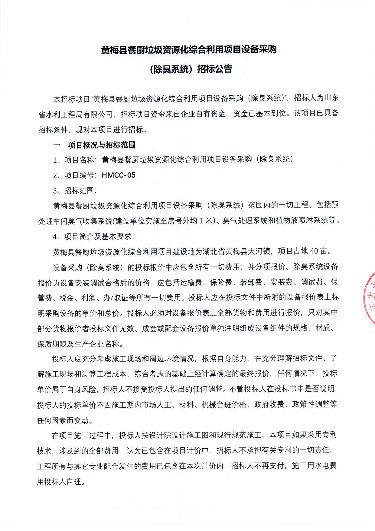 黃梅縣餐廚垃圾資源化綜合利用項(xiàng)目設(shè)備采購 (除臭系統(tǒng))招標(biāo)公告