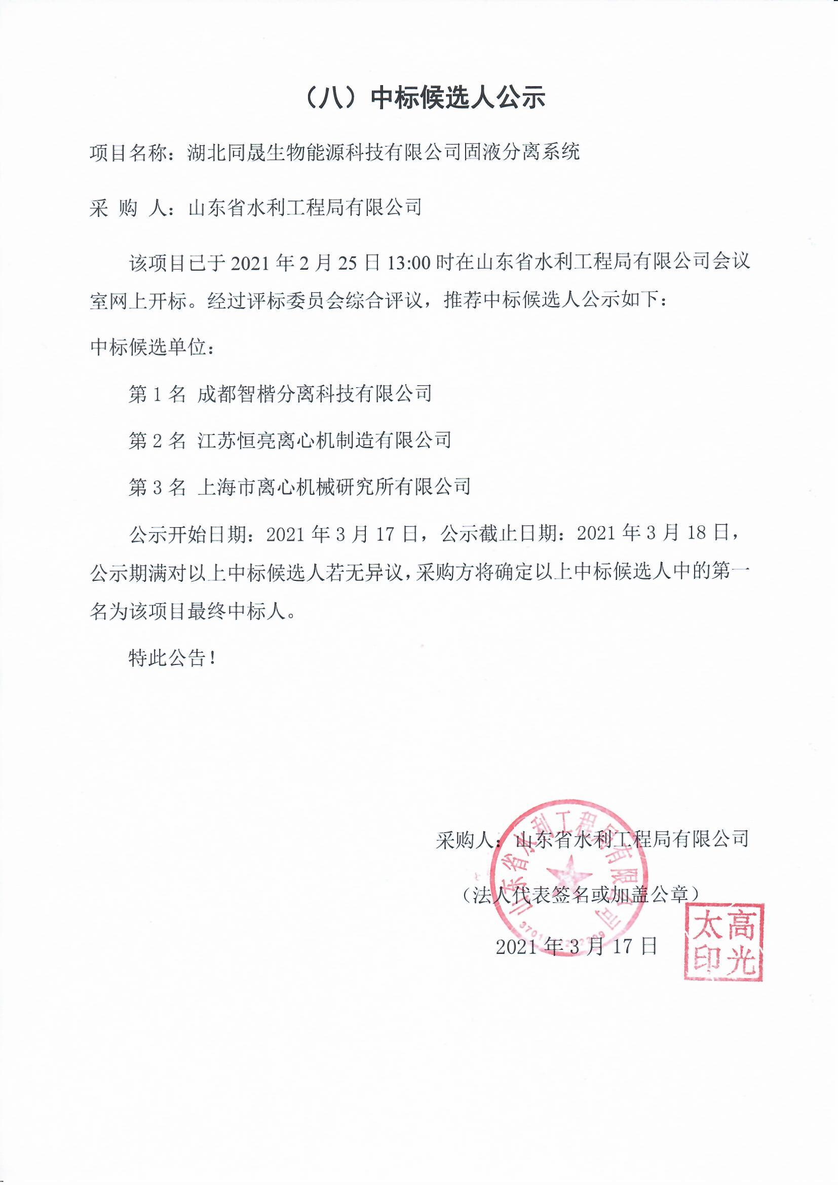 湖北同晟生物能源科技有限公司固液分離系統(tǒng)中標(biāo)候選人公示