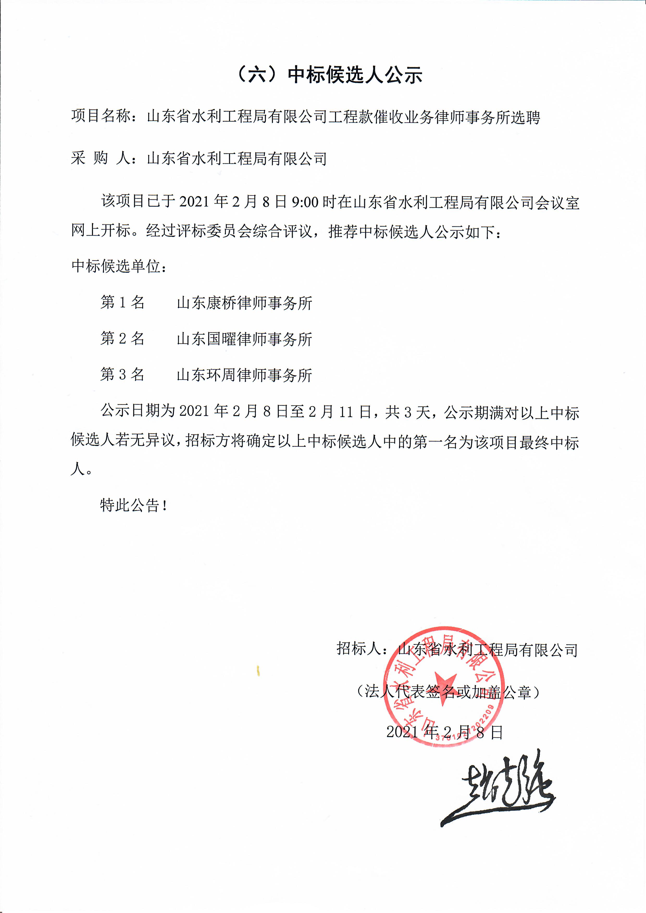 工程款催收業(yè)務(wù)律師事務(wù)所選聘中標候選人公示