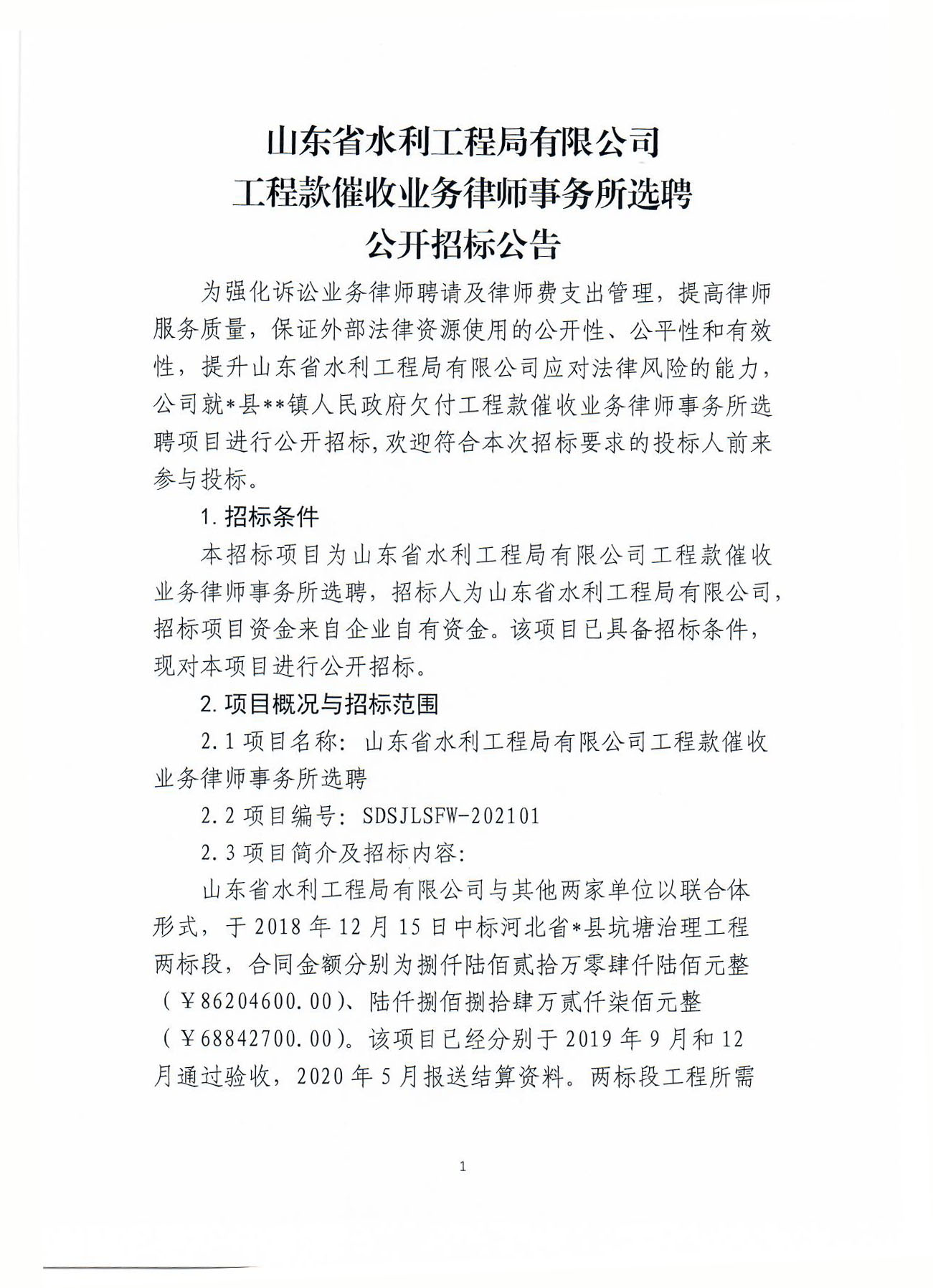 山東省水利工程局有限公司工程款催收業(yè)務(wù)律師事務(wù)所選聘公開招標(biāo)公告
