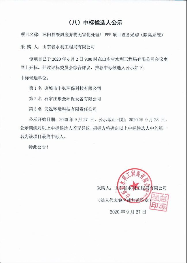 沭陽縣餐廚廢棄物無害化處理廠PPP項(xiàng)目設(shè)備采購(除臭系統(tǒng))中標(biāo)候選人公示