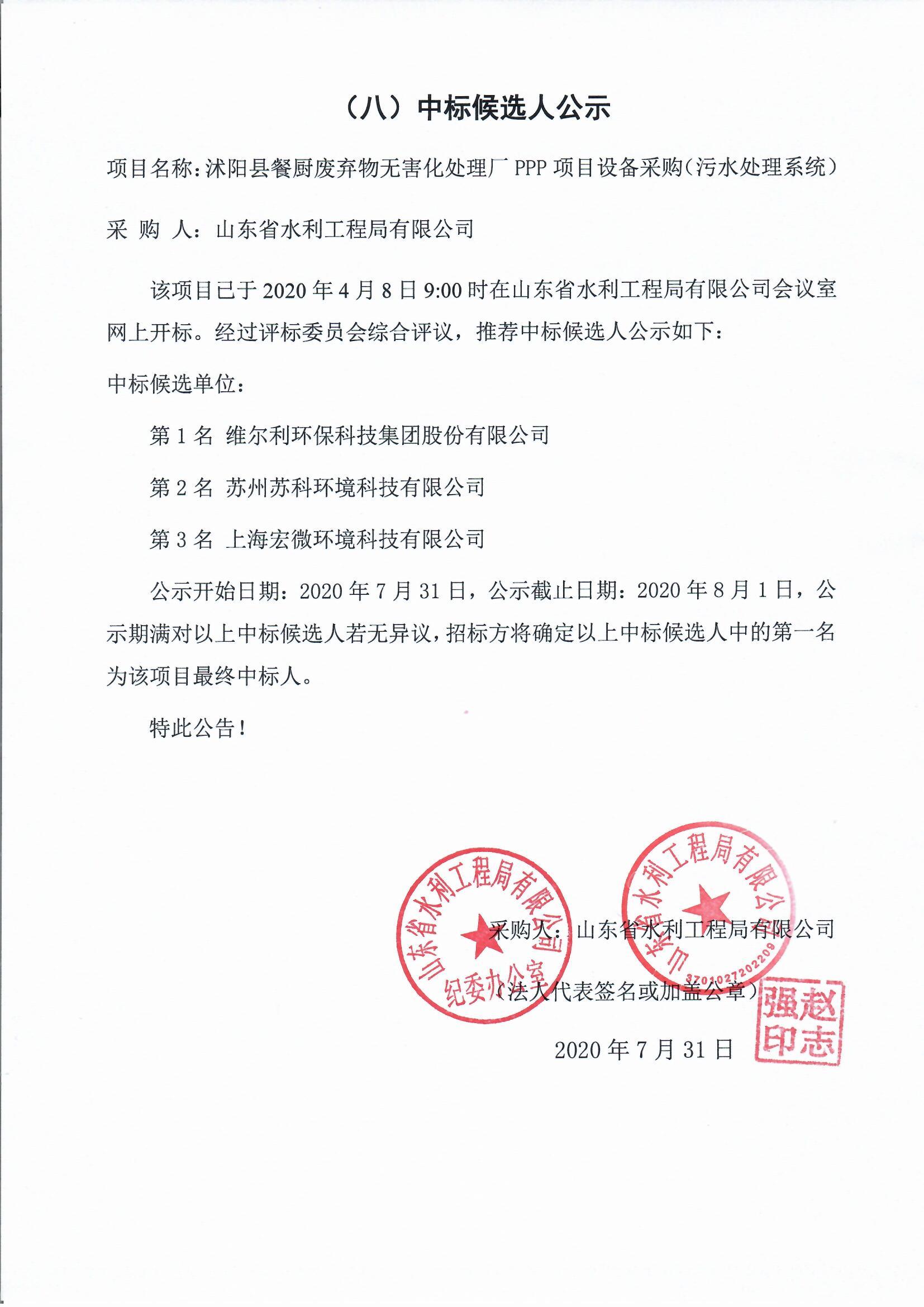 沭陽縣餐廚廢棄物無害化處理廠PPP項目設(shè)備采購(污水處理系統(tǒng))中標候選人公示