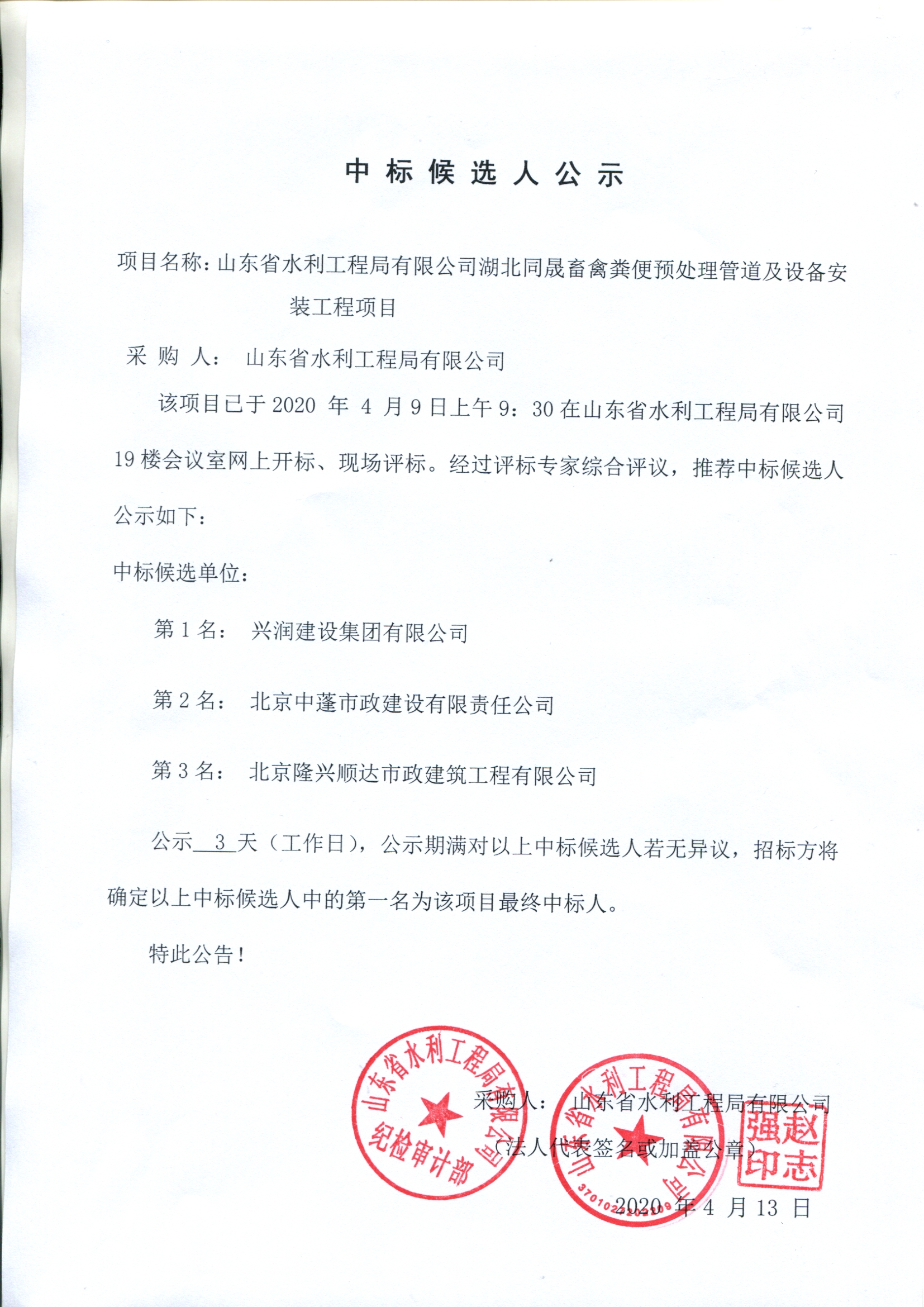 湖北同晟畜禽糞便預處理管道及設備安裝工程項目中標候選人公示