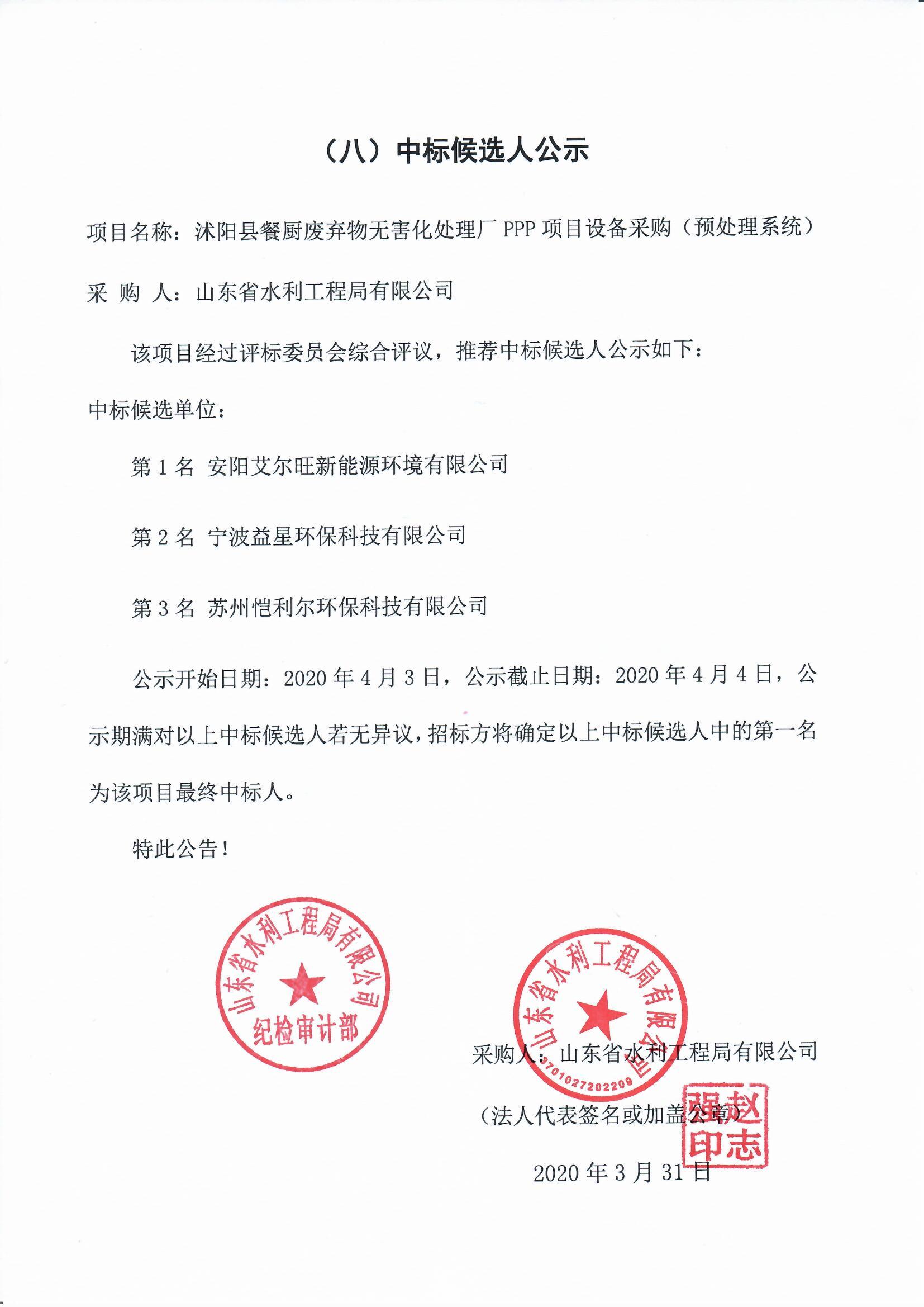沭陽縣餐廚廢棄物無害化處理廠PPP項(xiàng)目設(shè)備采購(厭氧消化系統(tǒng))中標(biāo)候選人公示
