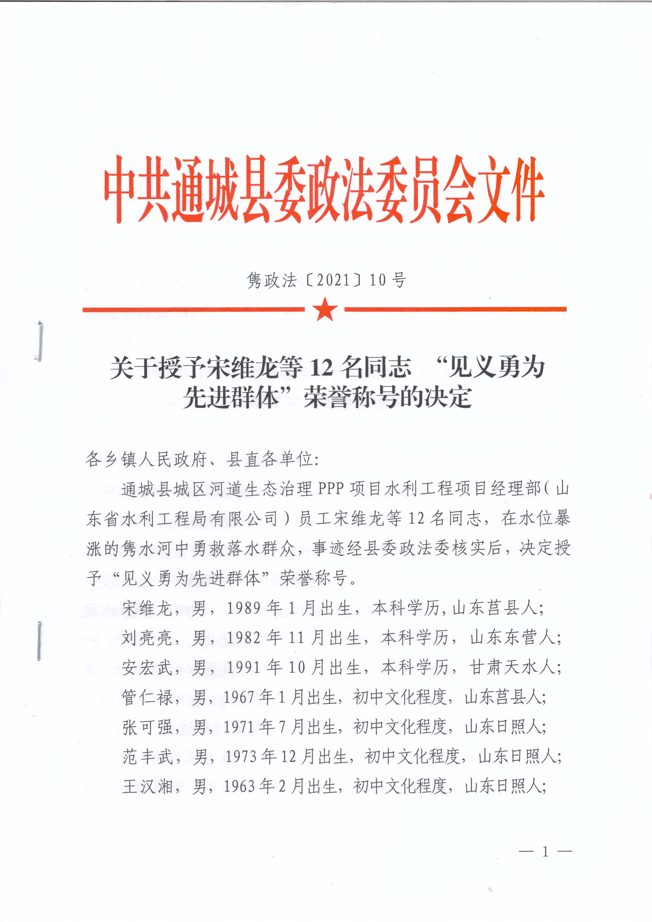 5月8日,為弘揚公司通城縣城區(qū)河道生態(tài)治理PPP項目部宋維龍等12名同志的見義勇為行為,中共通城縣委政法委員會決定授予宋維龍等12名同志“見義勇為先進(jìn)集體”榮譽稱號,號召全縣廣大干部群眾向他們學(xué)習(xí)。12名同志的 ...
