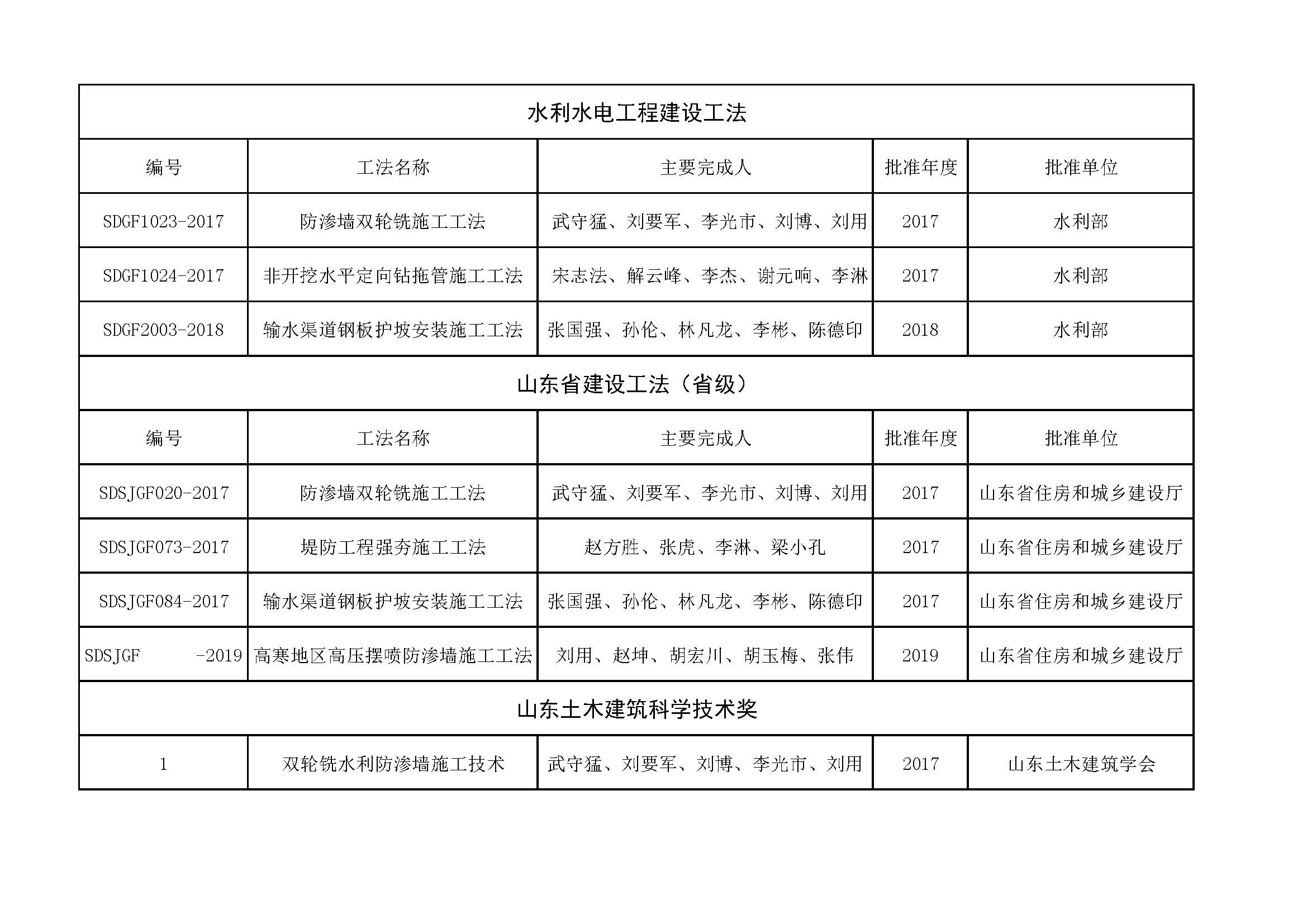 水利水電工程建設工法(部級)、山東省省級工程建設工法情況